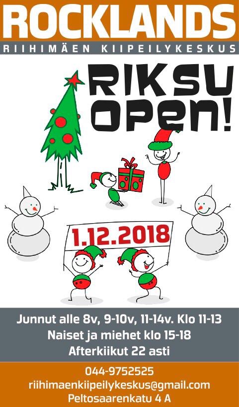Ilmoittautuminen on sitova kisamaksun jälkeen. Maksun voi suorittaa tiskille tai tilisiirrolla: Riihimäen kiipeilijät ry FI13 1132 3000 4329 90 NDEAFIHH Merkitse viestikenttään ”Kisamaksu: Riksu Open 1.12.2018”